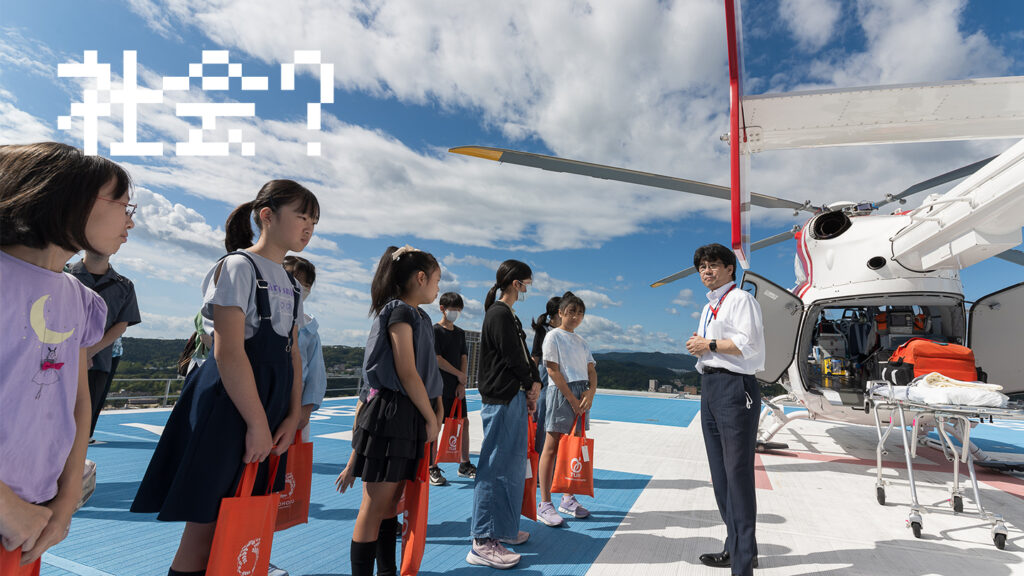 少し足がすくむような階段をのぼりきると、一気に広がる仙台の街。「高い!」と思わず声が出る子どもたち。ここは、日本で最も高い場所にあるヘリポートです。陽ざしを浴びて輝くドクターヘリが、すぐ目の前に停まっています。乗り込んで座席に腰掛け、装備された医療機器を間近に眺めました。「救急車とどう違うのですか?」「一日何回くらい出動するのですか?」次々に飛び出す問いかけは、命を運ぶ場面を想像するからこそ。自分たちの生活のすぐそばにある非日常を、子どもたちは確かに感じ取っていました。