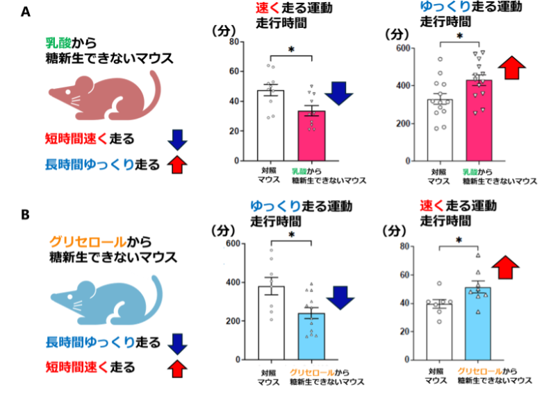東北大学大学院医学系研究科糖尿病代謝・内分泌内科学分野および東北大学病院糖尿病代謝・内分泌内科の金子慶三講師、堀内嵩弘特任研究員、片桐秀樹教授らのグループは、運動の強さに応じて、肝臓での糖新生に使われる基質が異なることを明らかにしました。ゆっくり走る軽い運動ではグリセロール、速く走る激しい運動では乳酸を基質とした肝臓の糖新生が活発化することにより、運動が持続できていることを発見しました。さらに、肝臓の酸化還元反応を促進させると、糖新生が亢進(こうしん)し、運動持久力が向上することも確認されました。