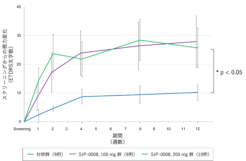 治験に参加した時点からの視力(ETDRS文字数)の変化量。SJP-0008 100 mg群とSJP-0008 200mg群は、対照群と比較して視力改善が大きいことが示されている。SJP-0008 200 mgは対照群と比較して、統計学的に有意な視力改善が得られている(*)。