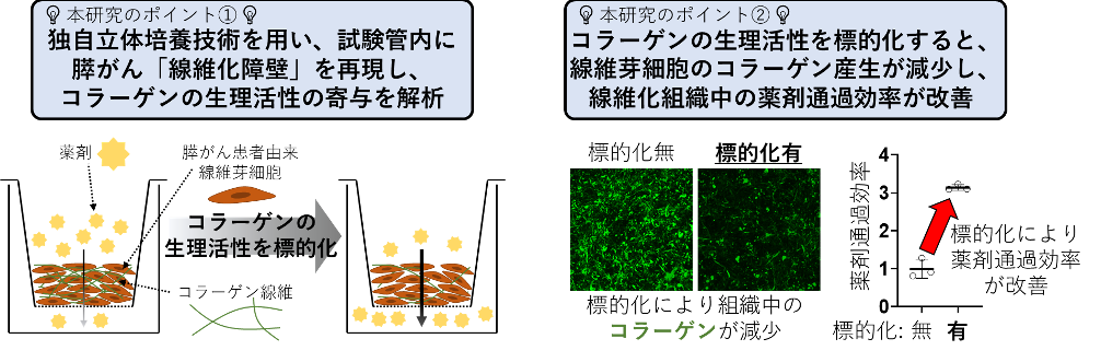 - 線維化組織中のコラーゲンは薬剤送達を物理的に妨害すると考えられていましたが、本研究では初めてコラーゲンの生理活性の寄与を明らかにしました。