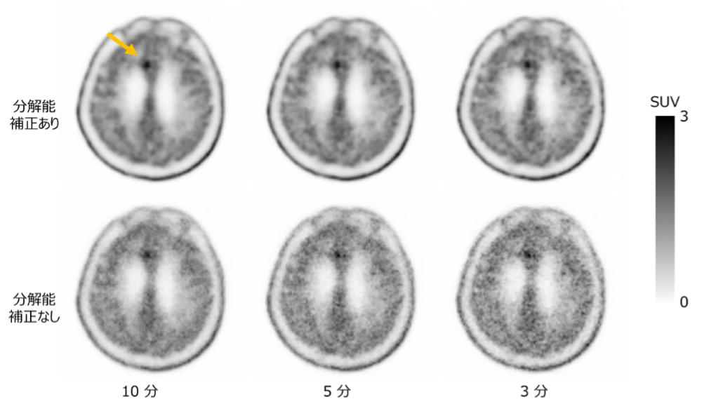 これらの結果より、SiPM PET/CT装置によるメチオニンPET検査では、短時間スキャンでも分解能補正を応用することで臨床応用可能な画質・定量性が得られることが示唆されました。