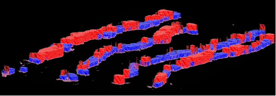 生検検体の3次元再構成データ上に、病理プロファイルの基となるAIが抽出した100種類の病理学的特徴の分布を可視化したものである。各パッチに対して全摘検体から学習した特徴表現を適用し、「どの特徴が何%含まれるか」が赤と青の色分布(赤は高リスク、青は低リスク)とその高低(リスクの値)として示されている。これにより、生検検体という小さな標本内でも、腫瘍の異質性や微小な病理的パターンが空間的にどのように存在しているかを直観的に把握でき、中間推論スコアの基盤となる特徴の空間的広がりを視覚的に理解できる。