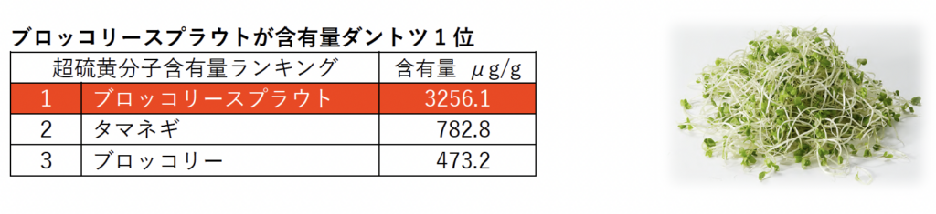 これまでの研究により、超硫黄分子を最も豊富に含む食材がブロッコリースプラウトであることが明らかになっています2。ブロッコリースプラウトは、体の抗酸化力や解毒力をサポートする有用成分「スルフォラファン」を豊富に含むことで知られ、健康に寄与する野菜として高い評価を受けています。一方で、超硫黄分子は非常に多様な物質群であり、その具体的な種類や構造、健康への作用については未解明な部分が多く残されています。