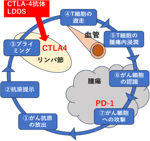 腫瘍免疫サイクルにおいて、リンパ節はCTLA-4が最も重要な役割を果たす場であることから、CTLA-4抗体薬をLDDSによりリンパ節へ直接投与することで、副作用を抑えつつ、効率的に免疫応答を活性化できるのではないかと考えました。