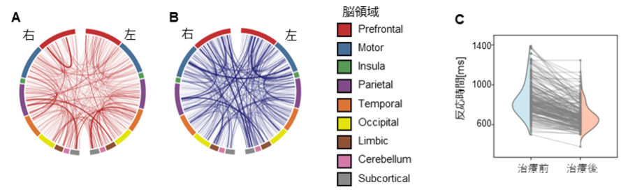 本モデルの最大の特徴は、モデル内部の計算過程を解析することで、「脳のどのつながりを変化させれば、特定の心理的・行動的特性を改善できるか」を数学的に特定できる点です。 本研究では、認知機能の一指標である「処理速度(反応時間)」を向上させるための最適な介入ターゲットを探索しました。解析の結果、前頭葉や頭頂葉、皮質下領域などの結合を強化し(図2A)、一方で運動野間の結合などを弱める(図2B)ことが、処理速度の向上に有効であると特定されました。 さらに、特定されたターゲットに基づき、コンピュータ上で脳結合を操作する「バーチャル介入」を行いました。その結果、多くのケースでモデル上の反応時間が短縮(処理速度が向上)しました。重要な点として、このシミュレーション上の治療効果には大きな個人差が見られ、劇的に改善するケースもあれば効果が限定的なケースもあることが明らかになりました(図2C)。これは実際の臨床現場で見られる現象と合致しており、本システムが介入効果の個人差を事前に予測するツールとして有望であることを示唆しています。