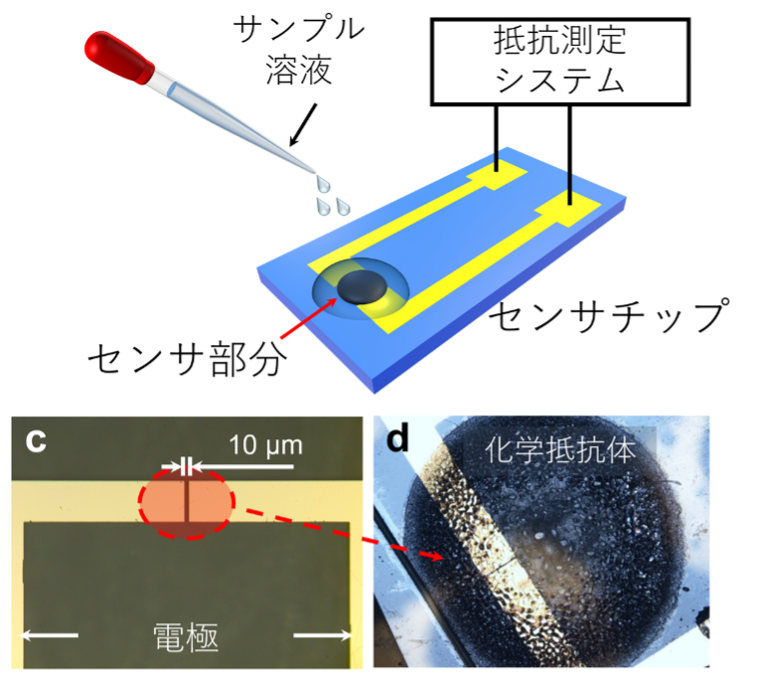 - ケミレジスタ型バイオセンサ:化学反応によって生じる材料の電気抵抗変化を検出原理とするセンサ。本研究では、酵素反応によって生じる反応生成物により電気抵抗が変化する仕組みを利用している。 ↩︎