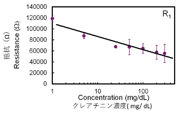 - 白金ナノ粒子4と酵素からなる電気抵抗体の抵抗変化で計測する抵抗変化型センサ(ケミレジスタ型バイオセンサ5)により、簡易かつ高感度なクレアチニン測定が可能であることを実証しました。