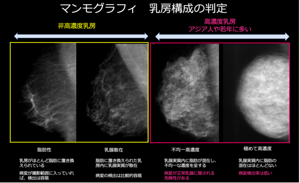乳房は主に乳腺と脂肪で構成されますが、マンモグラフィでは乳腺が白く、脂肪が黒く写るため、乳腺が多い乳房では白く濃く写ります。この乳腺が多いタイプを「高濃度乳房」と呼び、アジア人や若年層に多いとされます。マンモグラフィでは乳がんなどの病気は白く写るため、「高濃度乳房」では病気が乳腺に隠れて見つかりにくいという特性があります。