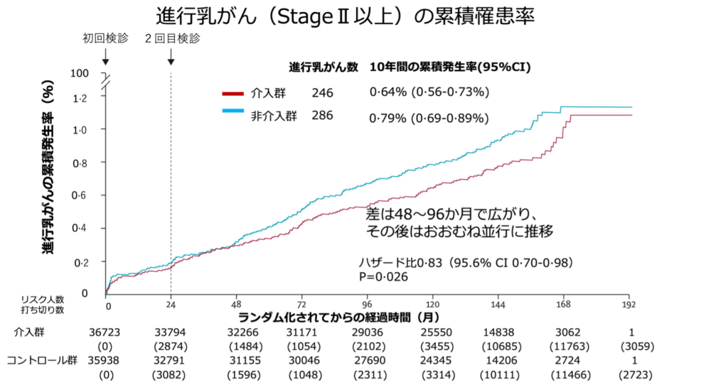 長期追跡において、超音波併用の介入群(赤線)は非介入群(青線)に比べ、進行乳がんの累積罹患率が低くなっていました(ハザード比0.83、95.6%信頼区間0.70–0.98、p=0.026)。10年時点の累積罹患率は、介入群0.64%(0.56–0.73%)、非介入群0.79%(0.69–0.89%)となっていました。矢印は初回検診および2回目検診の時点を示します。