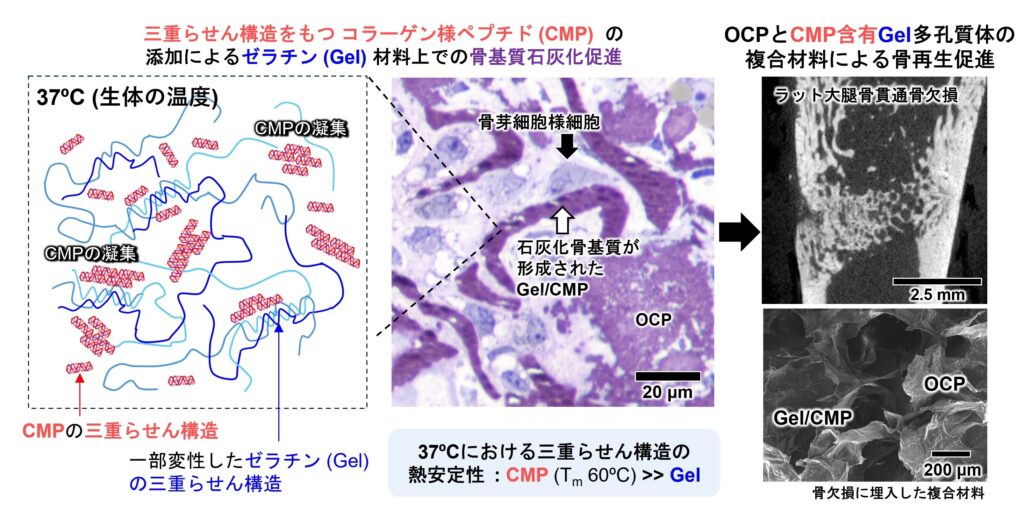 - 整形外科領域で骨補填材1として臨床応用されているリン酸八カルシウム2/ゼラチン3複合体(OCP/Gel)に、コラーゲン様ペプチド(CMP)4を複合化することで骨再生5能を増強させることを見出しました。