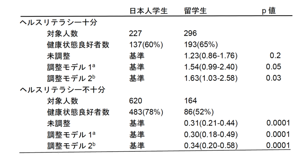 解析の結果、留学生の61%が健康状態を良好と回答したのに対し、日本人学生では73%でした。しかし、社会経済的要因や教育要因を調整すると差は縮小し(調整前:オッズ比0.56、95%信頼区間0.44–0.71 p<0.0001 → 調整後:0.72、0.53–0.99 p=0.04)、さらにヘルスリテラシーを考慮すると、国籍と健康状態の関連は有意ではなくなりました(0.81、0.58–1.14 p<0.2)。